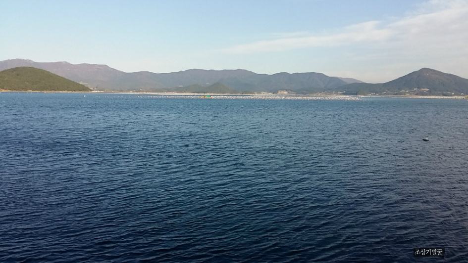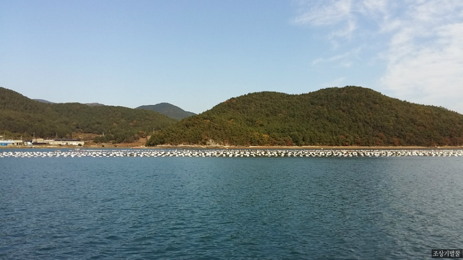 맑은 바닷물에 굴양식 부표가 일렬로 줄서있습니다.